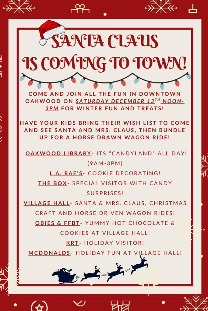 Come and join all the fun in downtown Oakwood on Saturday, December 13th noon – 3pm for winter fun and treats!