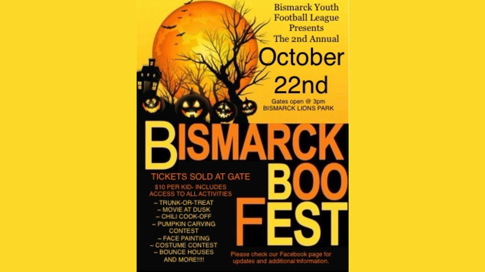 Bismarck Youth Football League presents the 2nd Annual Bismarck Boo Fest Gates open @ 3 PM - Bismarck Lions Park Tickets sold at Gate $10 per kid - includes access to all activities trunk-or-treat movie at dusk chili cook off pumpkin carving contest face painting costume contest bounce houses and More!!!