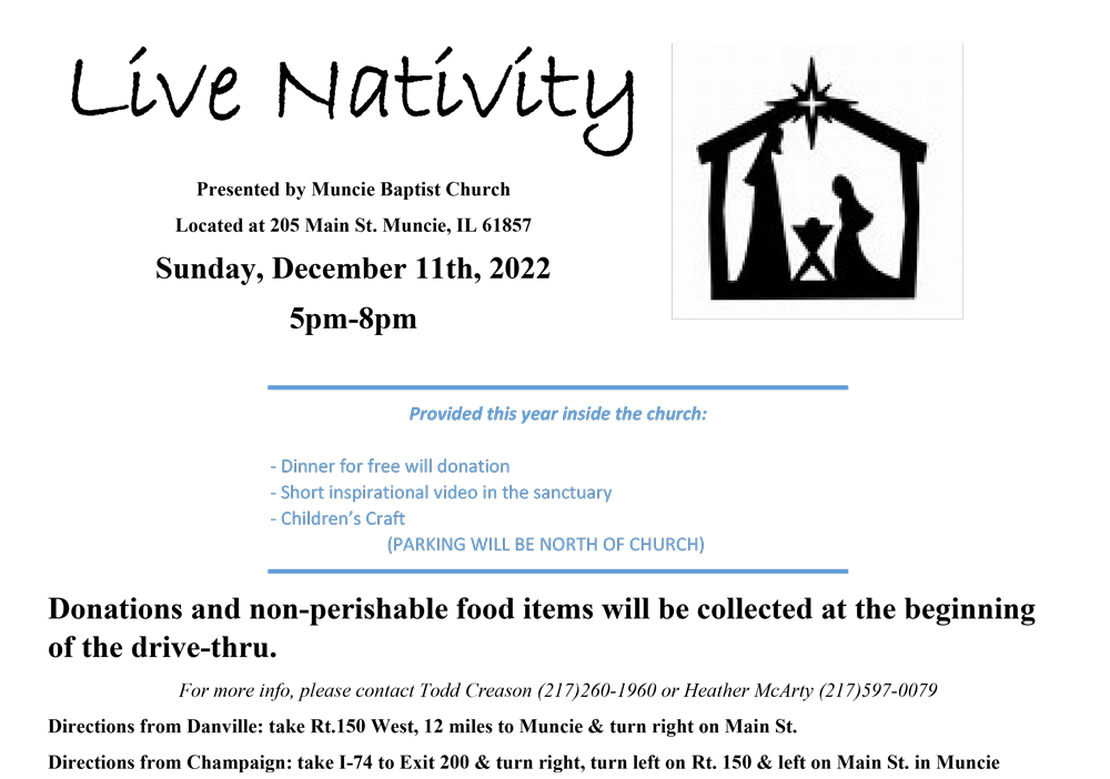39th Annual Live Nativity at Muncie Baptist Church! Come all ye faithful to the Muncie Baptist Church Live Nativity! This is a free community event! Drive thru the scene featuring live characters and farm animals! Then come inside for a free hot meal and children’s crafts! Come celebrate the reason for the season!